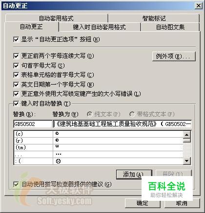 执行“工具→自动更正选项”命令,打开“自动更正”对话框(如图),切换到“自动更正”标签下,在“替换”下面的方框中输入“GB50502”,在“替换为”下面的方框中输入“《建筑地基基础工程施工质量验收规范》(GB50502—2002)”,再按下“添加”按钮,关闭对话框。