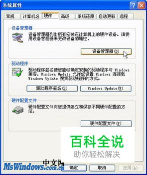 第1步,在桌面上右键单击“我的电脑”图标,选择“属性”命令,打开“系统属性”对话框。然后切换到“硬件”选项卡,并单击“设备管理器”按钮,如图2010041495所示。 图2010041495 单击“设备管理器”按钮