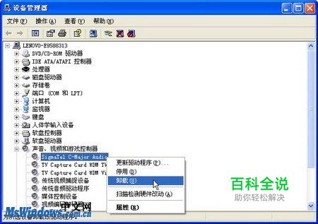 第2步,打开“设备管理器”窗口,展开硬件设备列表目录树。右键单击准备卸载的硬件名称(如声卡),选择“卸载”命令,如图2010041496所示。 图2010041496 卸载硬件驱动程序