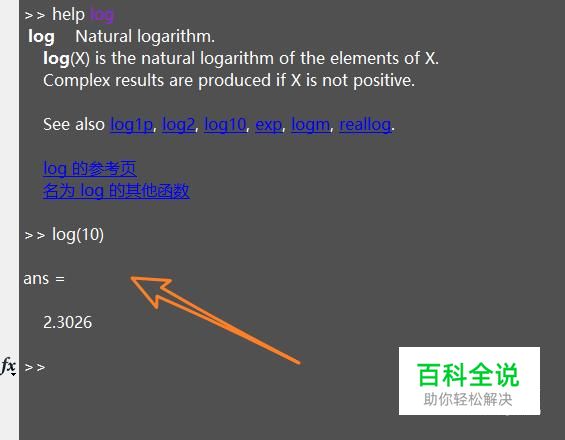 求loge(10)的对数,在matlab中的表达式就是log(10),如图