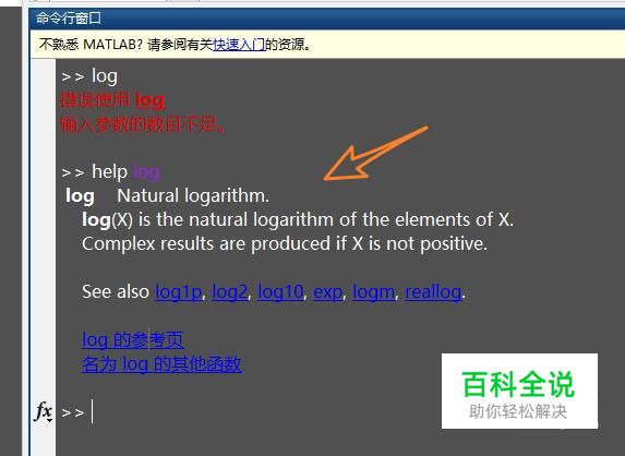 在命令窗口输入help log,可以查看帮助文档,如图,提示默认状态下log()的表示的是自然对数,也就是ln(),底数为e。