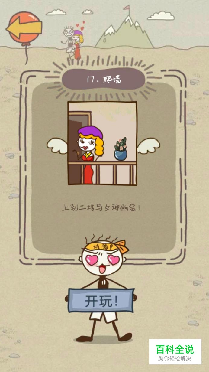 第十七关:爬墙。拖住女神的头发往下拉,再让史小坑顺着头发往上爬就可以见到女神了。