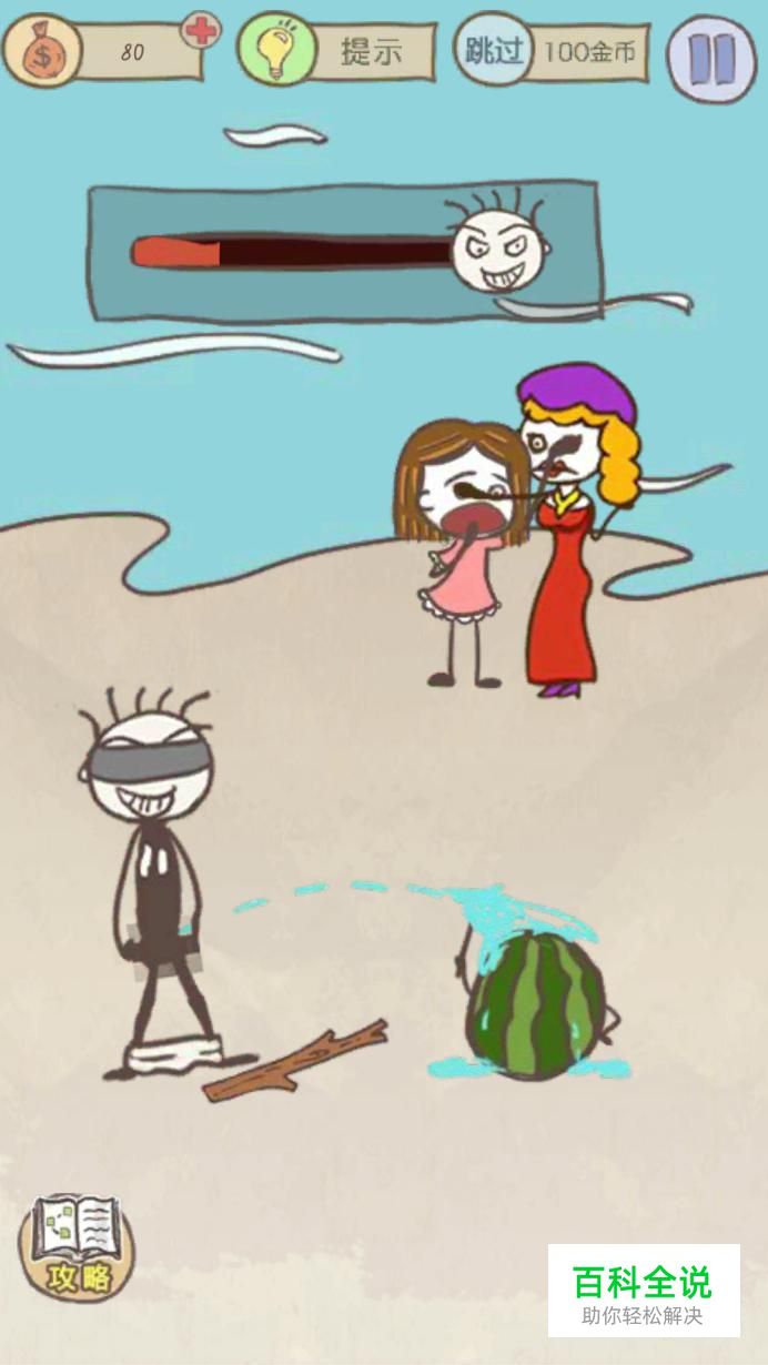 第十八关:打西瓜。往下拖史小坑的裤子,史小坑就会撒尿熄灭西瓜的炸弹。