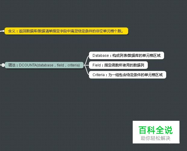 我们先从了解DCOUNTA函数的含义和语法开始。 含义:返回数据库/数据清单指定字段中满足给定条件的非空单元格个数。 语法:DCOUNTA(database,field,criteria),各参数官方释义见下图。
