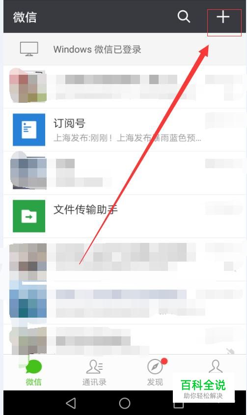 打开微信,首页点击右上角的“+”号添加微信公众号