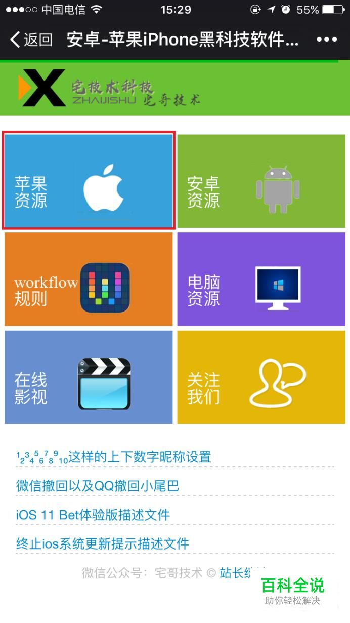 点击出来的链接进入到宅哥技术的首页,我们点击“苹果资源”。