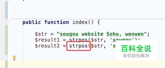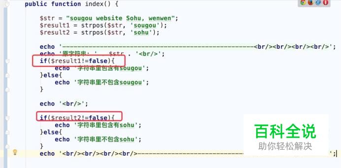 先看下我们的代码,如图,定义了一个字符串,然后调用php的strpos方法。 $result1 = strpos($str, 'sougou'); // 查找字符sougou在字符串出现的位置。 $result2 = strpos($str, 'sohu'); // 查找字符sohu在字符串出现的位置。 如果查找的字符不在字符串里,即字符串不包含查找的字符,strpos方法就会返回 false.