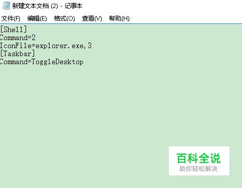 然后把如下的代码复制进去: [Shell] Command=2 IconFile=explorer.exe,3 [Taskbar] Command=ToggleDesktop