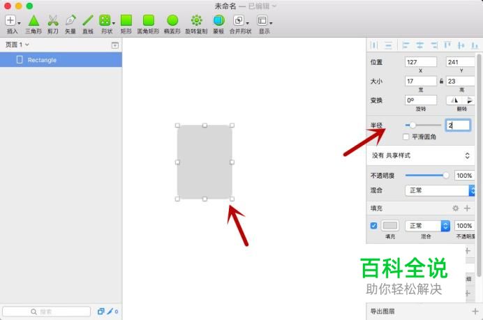 手机的四边都是有弧度的,选中矩形,然后在右侧属性栏中调整“半径”即可更改弧度。
