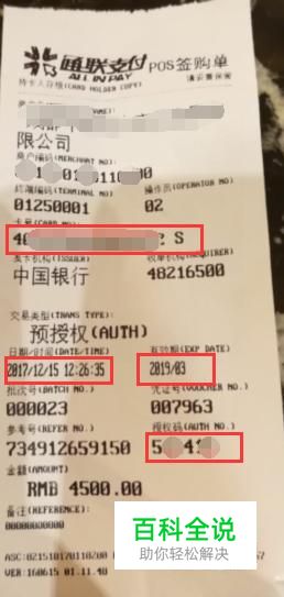 如图这是一张POS预授权单据,小编今天要教的是该如何做预授权完成;首先我们要确认的信息有四项:1、银行卡卡号 2、预授权交易时间 3、银行卡有效期 4、授权码