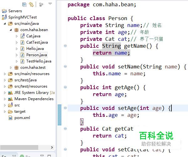 Spring是一个IOC(DI)的容器框架,一个典型的Spring项目需要创建一个或多个Bean,这些Bean的配置信息都在配置文件中,Bean的配置文件可以放在classpath下,也可以放在其他目录下。下面我们讲解如何在配置文件中指定两个Bean之间的依赖关系,创建两个类Cat和Person,Person类中的一个属性为Cat类型,如下图所示。