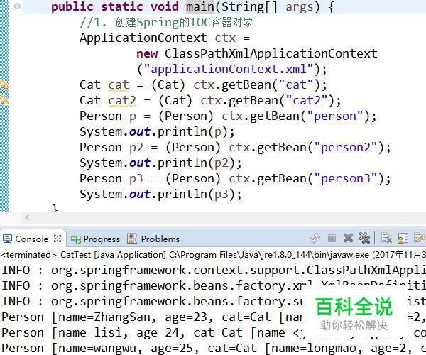 我们在创建的Cat类中定义4个属性,并且创建Cat类的无参构造、有参构造、getter和setter方法,重写toString()方法。创建Person类,同样创建getter和setter方法,重写toString()方法。我们为Cat类创建一个bean,id为cat2,bean的创建方式沿用上文,不明白的朋友可以查看小编之前的文章。接下来创建Person类的bean,使用属性注入的方法添加属性,可以使用property的ref属性建立bean之间的引用关系,如下图所示。我们在运行结果中可以看出打印Person类的对象时,输出的信息有cat的值。