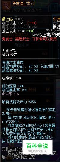 dnf荒古遗尘太刀还有一些特殊属性加成,可以将角色自身最高的属性进行强化,将角色的优势强化到最强。并且每次攻击还能吸收3点魔能,最高100点,弥补了蓝不够用的缺陷。还能释放火焰吞噬,武器自身可以对敌人造成技能伤害,非常厉害的一把武器。