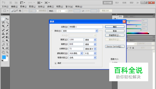 新建一个1280*800像素的白色背景,设置分辨率为72,设置颜色模式为RGB模式,新建画布的颜色可以自由的选择,系统中自带黑色,白色和前景色和背景色等颜色。点击确定。