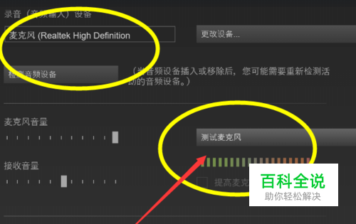 在语音设置下我们看到右边麦克风输出选项,这里我们选择自己的麦克风驱动,会有独特标识的。然后点击下面的测试麦克风,这个时候对着麦克风说话就能知道自己的麦克风和语音好坏了。