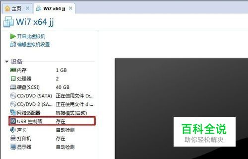 打开虚拟机,选中需要修改的虚拟机系统,在右边找到中文字样的USB控制器选项,(如果没有这个选项,就直接看步骤2,如果已经有这个选项,就直接看步骤3)