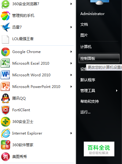 点击桌面左下角的“开始”按钮,选择“控制面板”