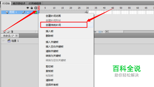 接着,我们回到第一帧,右键第一帧,选择“创建传统补间”