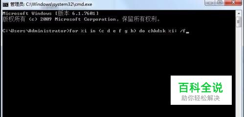 进入dos界面后,输入“for %i in (c d e f g h) do chkdsk %i: /f”,然后回车。