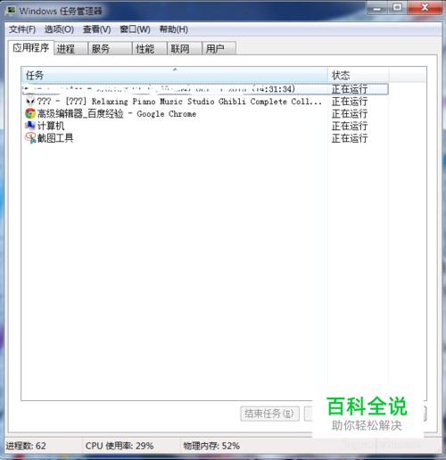 任务管理器的日常使用之" 应用程序" 在"应用程序"项中,会列出所有你当前启动了的前台程序,你可以选中一项来结束任务或切换到该程序,不过这两个功能并不好用,日常使用率也不高(因为直接操作更方便)