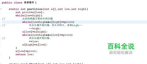 详细讲述每段代码的意思。该段代码讲述的是,一次排序过程,将原部分分成两部。左部小于轴值,右部大于轴值;