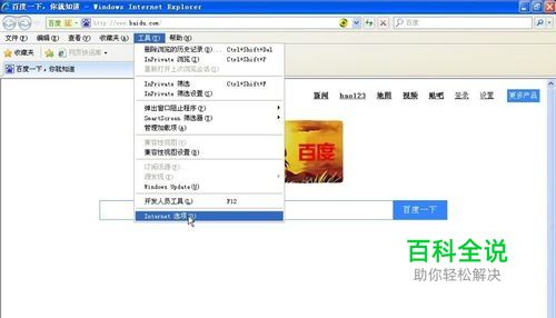 打开iel浏览器在工具栏上找到工具按钮,点击弹出下拉菜单,找到Internet选项,单击该选项。