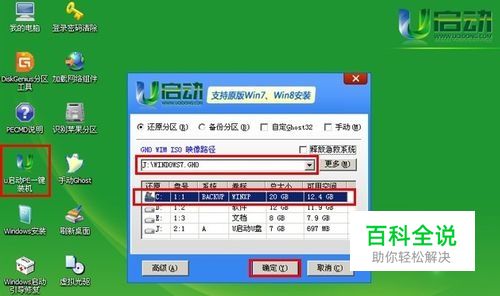 进入03PE系统后,双击运行u启动PE一键装机工具,程序会自动搜索电脑各个盘中镜像文件并显示出来让你选择,若程序没有识别到你要的系统映像文件,可以点击右边的“更多”按钮进入选择。当系统镜像选择完毕后需要选择的是系统安装磁盘(一般都是选择C盘),一切选择完毕后点击“确定”按钮即可;如下图所示: