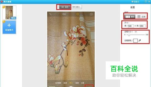 第三步进行拼图设置:图片尺寸选择适应——排版可以选择横排或竖排——再 设置尺寸的宽和高——再设置边框的大小和颜色。