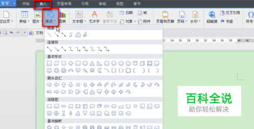 在这里小编用插入图形来做实例,点击“形状”,如下图所示选择自己想要插入的图形。