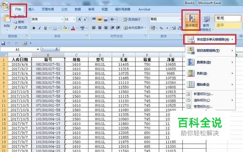 点击开始选项卡-然后点击-条件格式,弹出的菜单中点击-突出显示单元格规则。