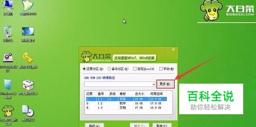 登录到pe系统桌面,系统会自动弹出大白菜PE装机工具,点击“更多”,再点击“打开”进入下一步操作。