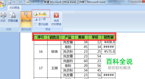 接下来我们进行一下打印预览,我们可以点下一页进行一下预览,就可以看到第二页的数据最上面的标题行也就自动添加上了我们设置的。这样我们在看的时候就方便多了。