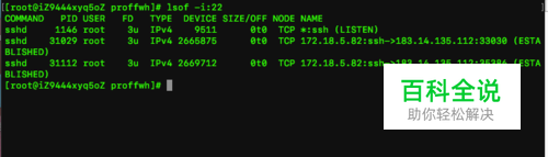 lsof -i:端口号,用于查看某一端口的占用情况,比如查看22号端口使用情况,lsof -i:22,如下图