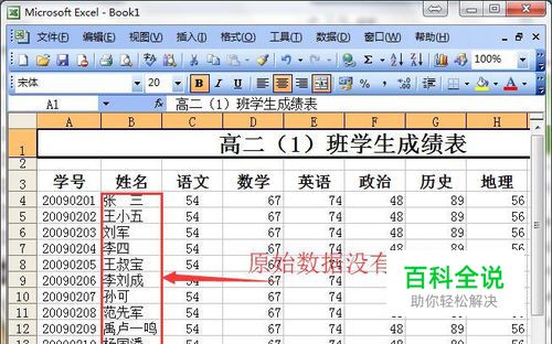 如图所示,我们打开原始Excel表格,发现姓名列内容是不对齐的,因为单元格里面的字数是不统一的。