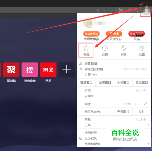 点击浏览器中的头像,在弹出面板中找到“书签”。
