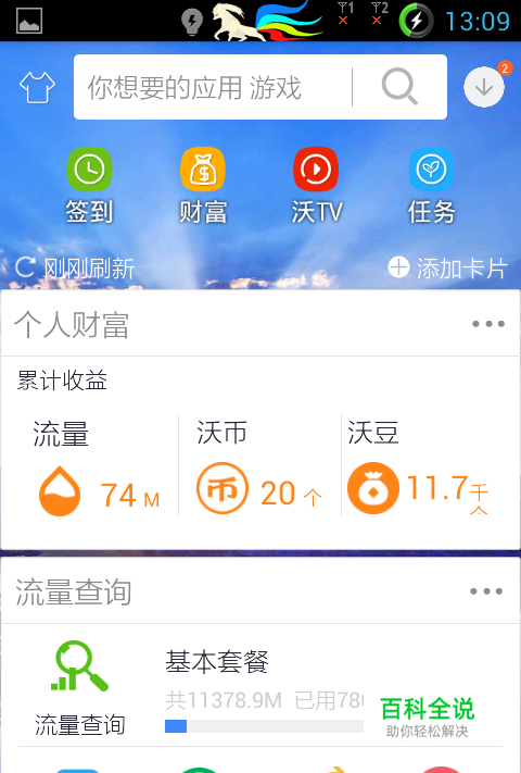 当你的流量消耗到一定时,你可以点亮流量钻石,你还可以点击”沃豆“进去领沃豆, 同时你可以点击"欢乐百宝箱“游戏等进行游戏,还是要看你等级的才可以玩,还有其他好玩的你自己睇睇,我就不哆嗦了