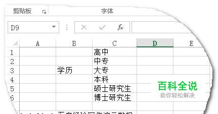 在【设置】中将【验证条件】的允许选择为【序列】,在来源里输入“高中,中专,大专,本科,硕士研究生,博士研究生”,三英文状态下的逗号隔开,点击确定
