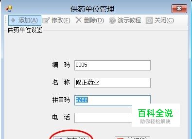 本系统进行药品入库,需要先录入供药单位信息,在这里先向大家介绍一下供药单位的设置流程,通过基础资料(T)菜单打开“供药单位设置”设置窗口,如图 然后点击“添加”按钮,然后录入编码、名称、拼音码、联系电话,最后点击保存即可,如图