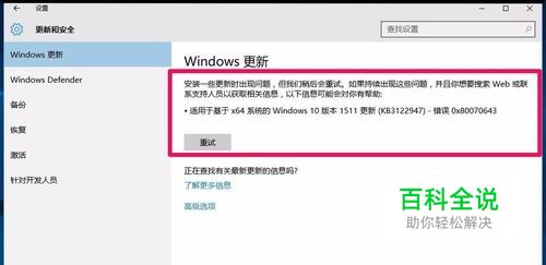 在Windows更新窗口,有个【重试】,我们左键点击: 重试;