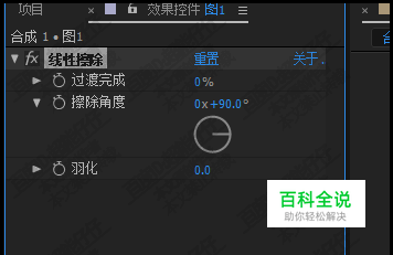 给图2同样添加线性擦除过渡效果。 在过渡完成这里打关键帧,在5秒这里,设置过渡完成值为100
