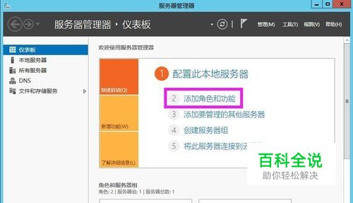 首先,打开“服务器管理器”,点击“添加功能和角色”。