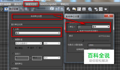 设置单位 3Dmax默认的单位是美式标准,这里我们要设置成室内设计用的毫米。 菜单栏中 自定义->单位设置 设置单位为毫米,然后点击 系统单位设置,设置系统单位比例为1单位=1毫米。