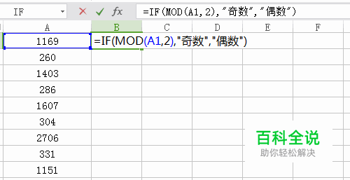 然后在后面一列的单元格中输入mod函数(mod函数是一个求余函数,即是两个数值表达式作除法运算后的余数。)利用这个函数就可以计算出这个数值是奇数还是偶数。输入公式:=IF(MOD(A1,2),"奇数","偶数"),A1代表的就是数值所在的列。