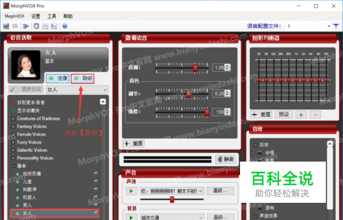 第二步: 在电脑上打开MorphVOX Pro变音大师,选择假声并开启【聆听】进行调试,调试出一个完美的效果之后,就可以开始我们的下一步啦。要注意的的是MorphVOX Pro变声器的【聆听】不要关闭,关闭后你手机等会变声的时候就不会有声音了。