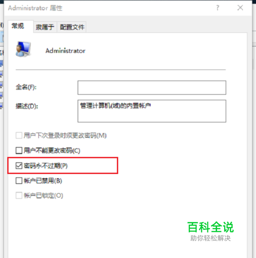 第三步进去Administrator属性界面之后,勾选“密码永不过期”,其他的勾选去掉,点击确定,如下图所示:
