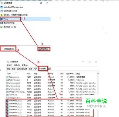 如果打开“任务管理器”呈现的是“简略信息”模式,就按照上图“1->2”的顺序,来结束被占用的 Word 进程;如果打开“任务管理器”是“详细信息”模式,就按照上图“A->B->C->D”的顺序来结束被占用的 Word进程。