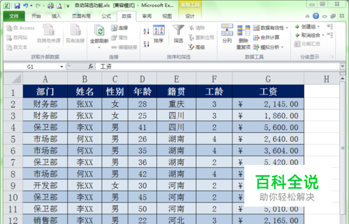 选择“数据”菜单选项卡,在工具栏中单击“筛选”按钮,此时将会在列标题中显示一个三角形。