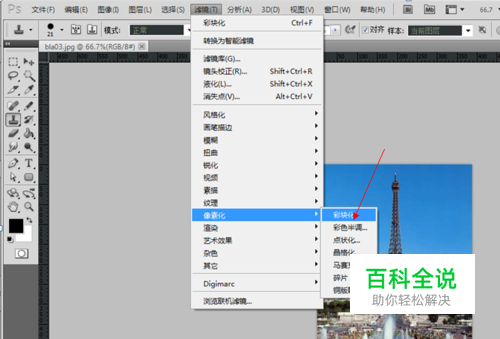 作出如图所示的选择,选择,滤镜-》像素化->>彩块化,对图片进行处理。如下图所示。