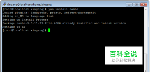 首先需要登入安装了Linux系统的计算机,安装Samba。Fedora发行版一般使用yum工具安装Samba服务器,可以使用“ rpm -q samba”查询Samba服务器是否已经安装,当然,也可以直接使用“ yum install samba”安装Samba服务器。如果Samba已经安装,yum会给出提示,否则按照步骤,输入“y”就可以直接下载安装Samba服务器了。