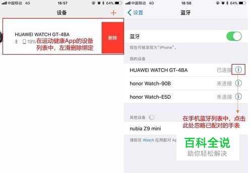 1. 操作步骤 (1)确保手表和原手机处于蓝牙连接状态,打开运动健康App解除和手表的绑定,若手机系统蓝牙已配对设备列表中有手表名称,请按照以下方法忽略: Android手机解除绑定方法: 在App中解除配对;